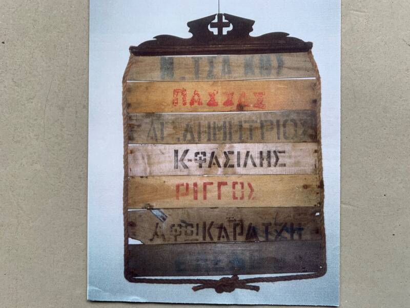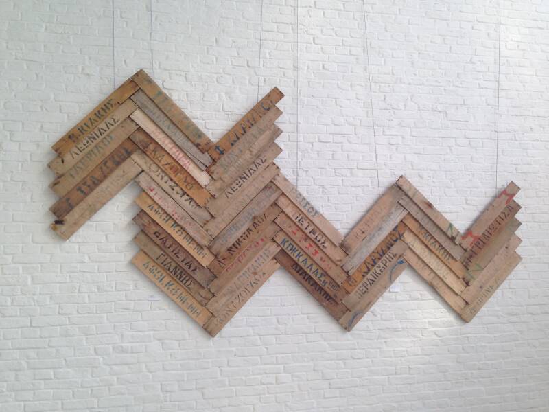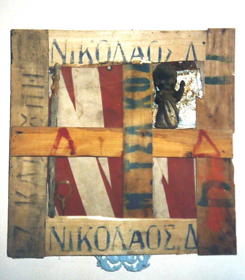 In de loop van 30 jaar verzamelde ik in Griekenland talloze plankjes van viskisten. Ik maak hier op verschillende manieren assemblages van. Tegenwoordig wordt de vis in plastic kratjes vervoerd.